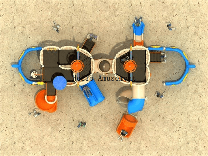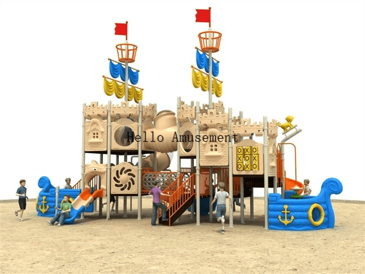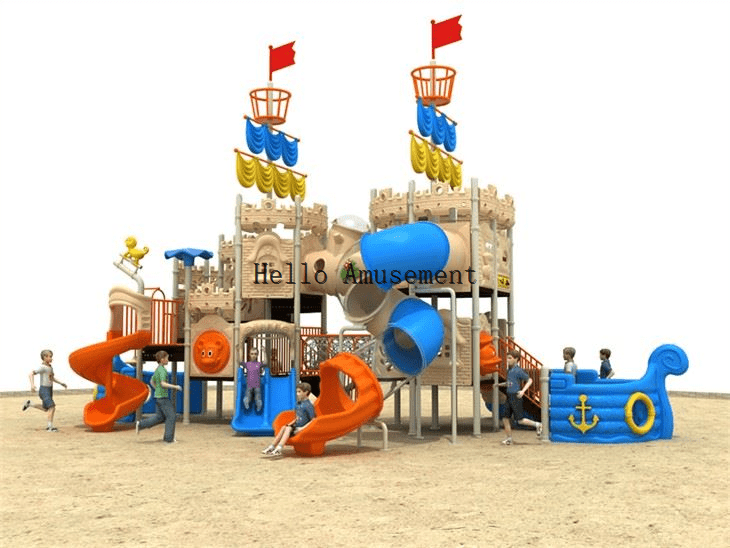 Pirate ship and slide is one of the more common combinations. The integration of pirate ship elements adds excitement and mystery to the entire set of slides, which makes it easier to attract children’s attention and stimulate their curiosity and exploration.